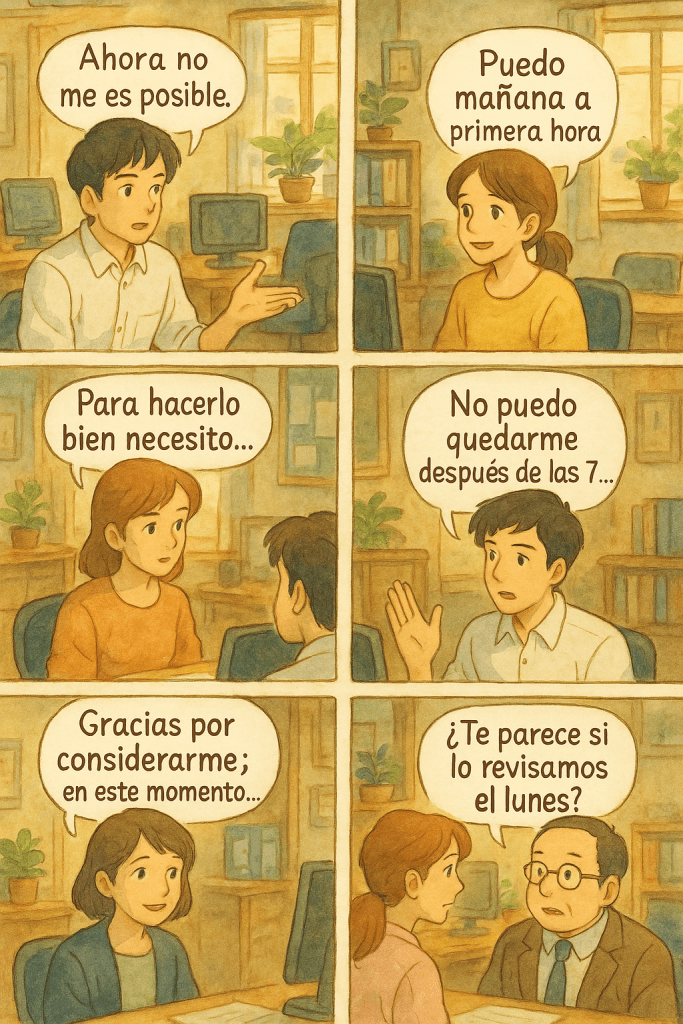 “Sé que el equipo necesita apoyo y normalmente no tengo problema en ayudar. Sin embargo, llevo varias semanas trabajando horas extra y necesito descansar para rendir bien. ¿Podemos buscar otra solución? Por ejemplo, repartir esta tarea entre varios o planificar mejor para no recurrir siempre a horas extras.”[25]