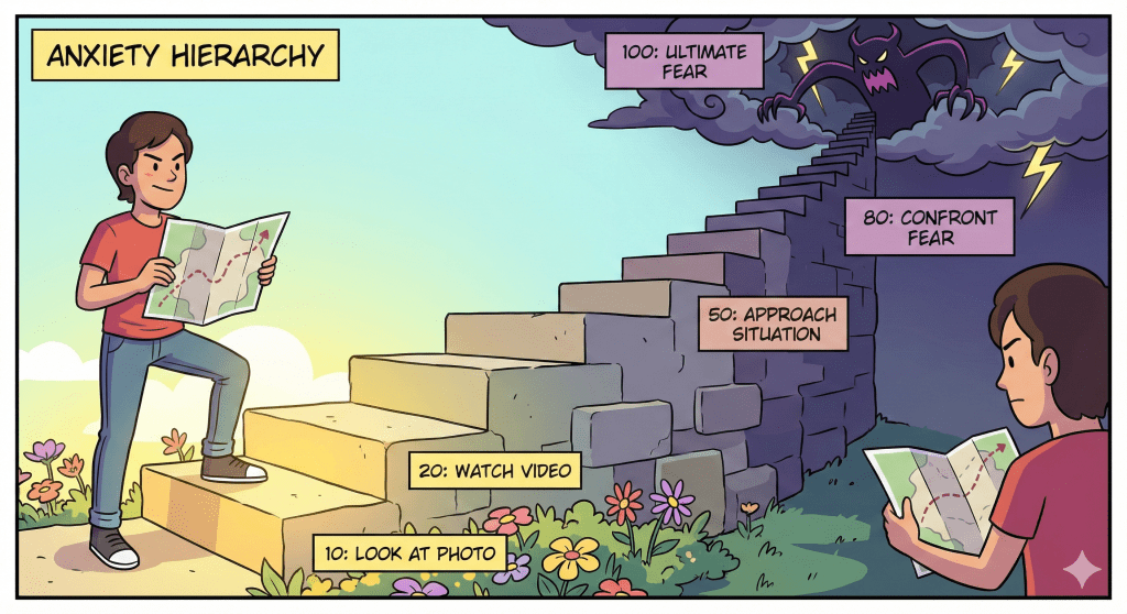 Una jerarquía de ansiedad no es más que una lista ordenada de situaciones relacionadas con tu miedo, clasificadas desde la que te causa una ansiedad mínima hasta la que te provoca un pánico absoluto. El objetivo es romper el miedo en pedazos digeribles.