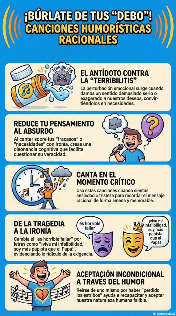 Esta técnica consiste en utilizar la ironía y el humor para restarle solemnidad a las exigencias absolutistas que generan malestar. Al cantar sobre nuestras propias ideas irracionales con letras jocosas, logramos distanciarnos emocionalmente de ellas, facilitando la aceptación de la realidad de una manera divertida y menos dramática.