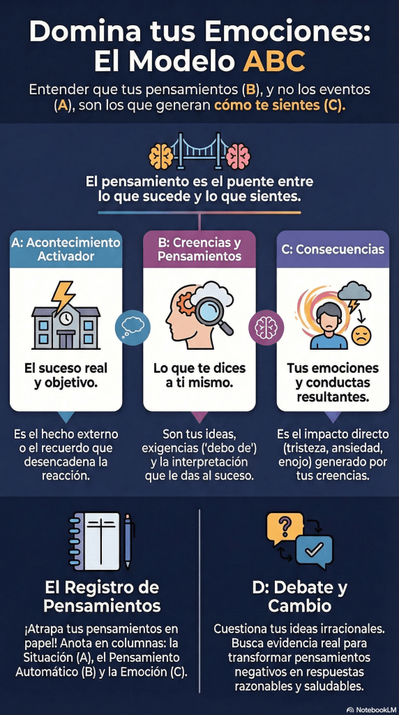 El modelo ABC es la herramienta central de la TREC para identificar cómo creamos nuestro propio malestar emocional. Su objetivo es demostrar que no son las situaciones externas (A) las que nos perturban directamente, sino la interpretación y las creencias (B) que mantenemos sobre ellas, lo que genera nuestras reacciones (C).