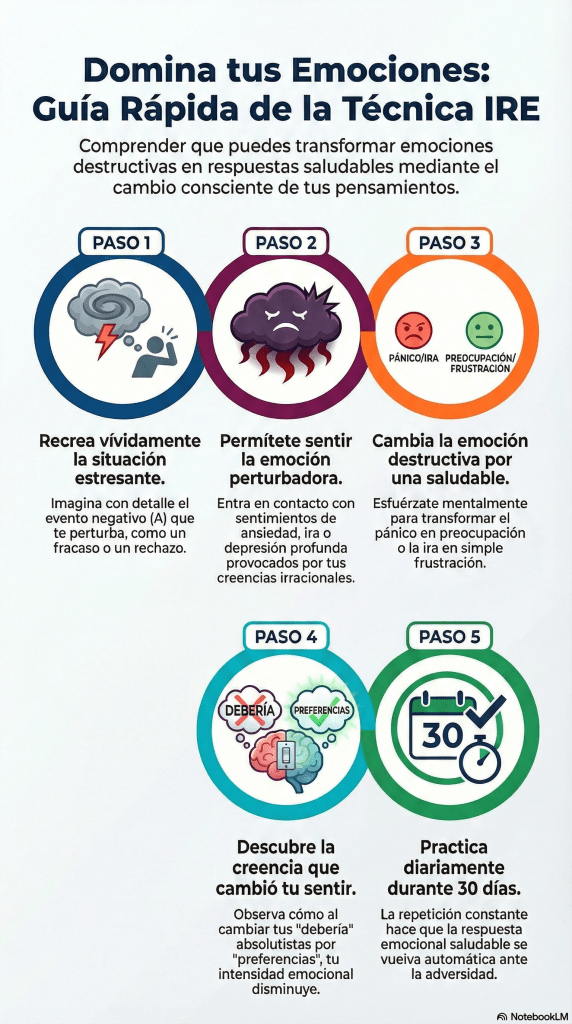 La Imaginación Racional Emotiva (IRE) es una técnica de entrenamiento mental diseñada para que la persona aprenda a transformar sus emociones intensas y paralizantes en sentimientos más funcionales y manejables ante situaciones difíciles. Su propósito fundamental es que quien la practica descubra cómo, al cambiar su forma de pensar (sus creencias), puede regular su respuesta emocional incluso manteniendo la imagen de un evento negativo.