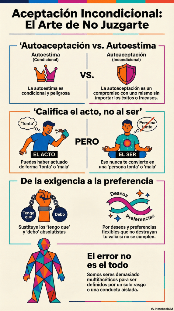 - Aceptación no es resignación: Aceptarte incondicionalmente no significa que no te importe actuar mal; significa que dejas de castigar tu valor personal para tener más energía y corregir tus conductas.+4