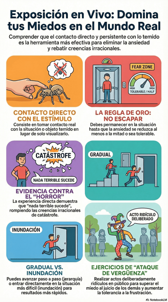 La exposición en vivo es una de las vías más rápidas para el cambio emocional. Al comprobar con la experiencia directa que «no es terrible» y que «puedes soportarlo», desmontas las creencias irracionales de raíz. Pasas de creer que eres frágil a saberte capaz de enfrentar el mundo tal como es.