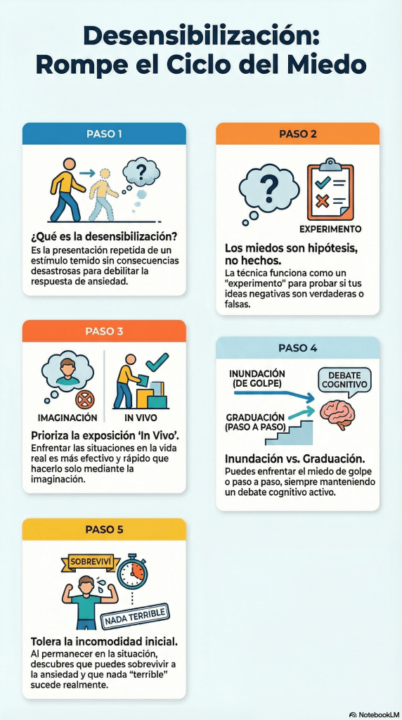 - Tarea: Escribir y enviar correos breves de manera rápida, revisándolos solo una vez. La desensibilización ocurre al exponerse a la posibilidad de que exista un error menor y comprobar que las consecuencias laborales son manejables y no catastróficas.