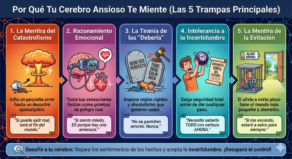El problema es que confiamos ciegamente en este sistema de alarma. Cuando sentimos el corazón acelerado y el nudo en el estómago, asumimos que el peligro es real e inminente. Pero la psicología cognitiva y la Terapia Racional Emotiva Conductual (TREC) nos han enseñado una verdad liberadora: en el estado de ansiedad, tu cerebro es un mentiroso compulsivo. Distorsiona la realidad para mantenerte «a salvo», pero en el proceso, te atrapa en una jaula de miedo.