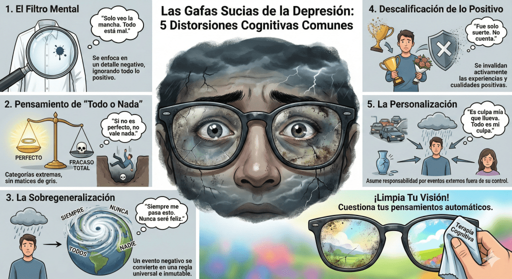 Aquí están 5 de las «gafas sucias» o distorsiones cognitivas más comunes que la depresión te obliga a usar, y por qué es crucial reconocerlas para empezar a limpiar tu visión.