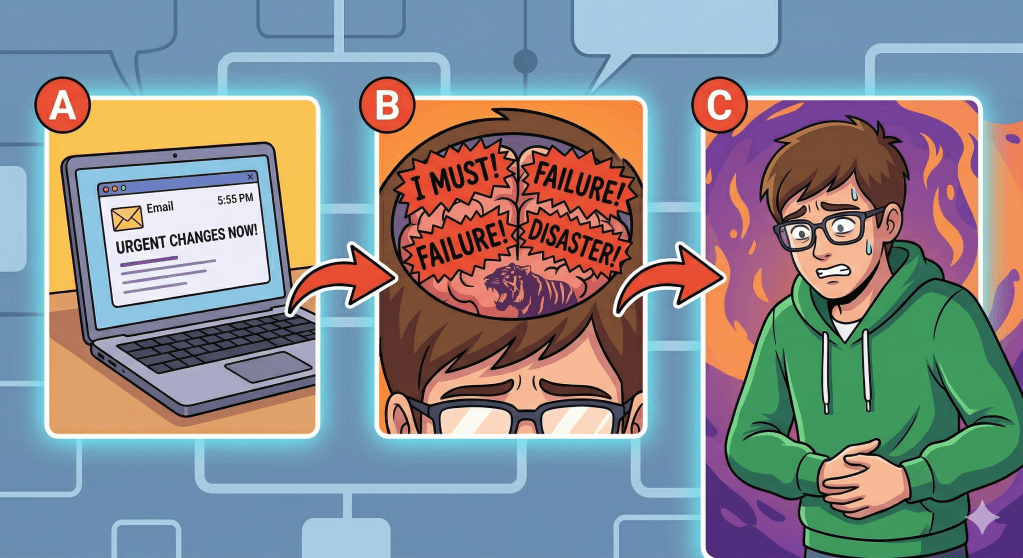 - A (Acontecimiento Activador): Recibes un correo a las 5:55 p.m. pidiendo «cambios urgentes».