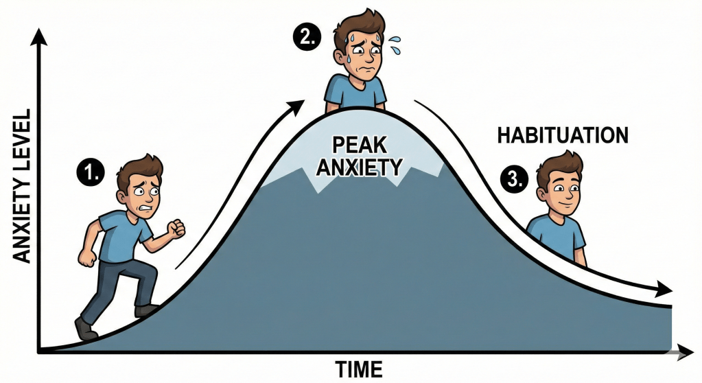 Para entender cuánta incomodidad es necesaria, debemos mirar la gráfica de la habituación. El concepto sugiere que la ansiedad no es una línea recta que sube hasta el infinito y te explota la cabeza (aunque así se sienta).