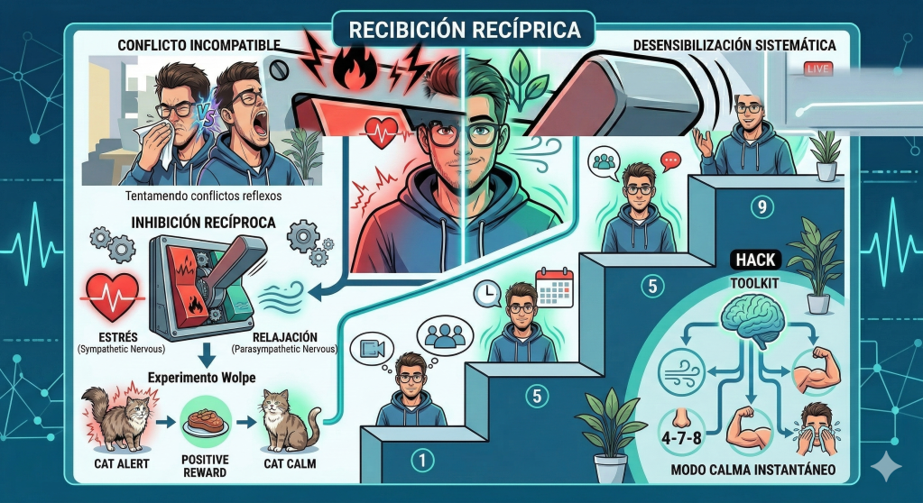 La Inhibición Recíproca requiere una respuesta fisiológica real, no solo un deseo mental. Por eso técnicas como la Relajación Progresiva de Jacobson o la Respiración Diafragmática son tan efectivas: obligan al cuerpo a cambiar de estado mecánicamente.