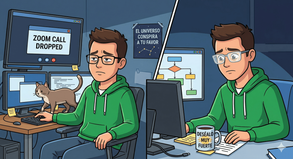 Si eres de los que trabajan frente a una pantalla 10 horas al día, probablemente te has topado con esa «positividad tóxica» que inunda LinkedIn y las tazas de café. Ya sabes: «Si lo deseas con fuerza, el universo conspirará». Déjame decirte algo: si el universo conspirara cada vez que alguien desea que su conexión a internet no se caiga en medio de una reunión por Zoom, viviríamos en un lugar muy diferente.