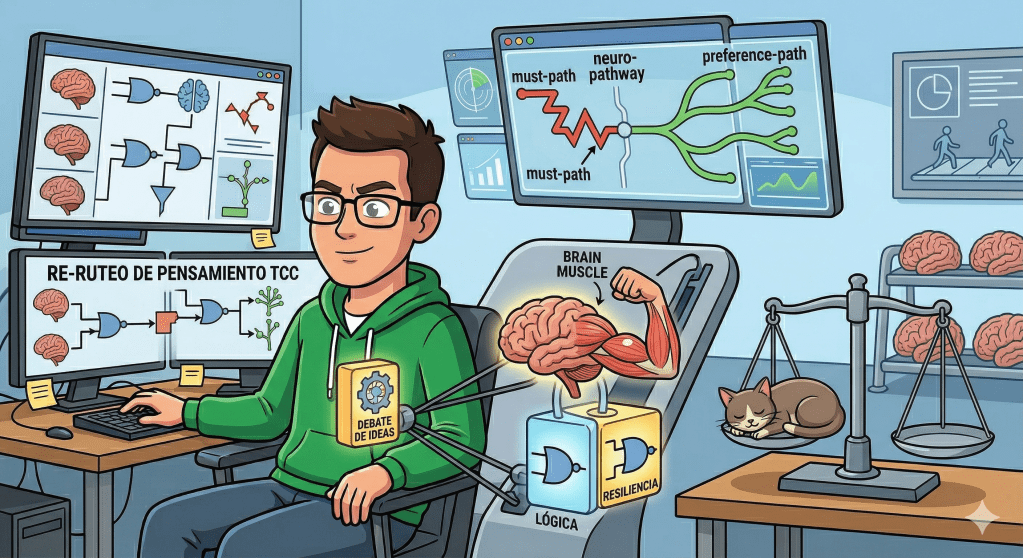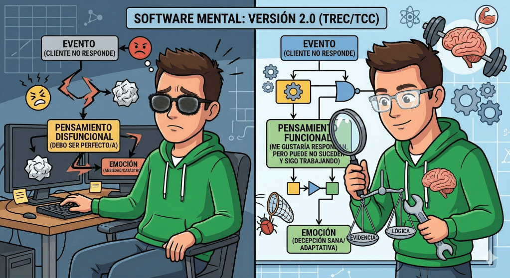 Cuando te dices «DEBO caerle bien a todos mis clientes», te estás preparando para la ansiedad. La TCC te enseña a cambiar esa exigencia rígida por una preferencia flexible: «Me gustaría caerles bien, pero si no sucede, no me convierte en un profesional inepto». Eso no es pensamiento positivo; es pensamiento funcional que te permite seguir trabajando sin que te tiemble el pulso.
